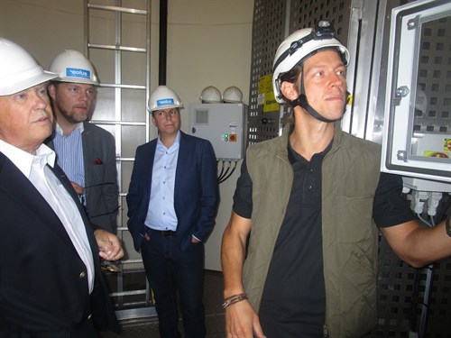 Företagarnas VD Günther Mårder i samspråk med Eolus VD Per Witalisson inne i ett av vindkraftverken i vindpark Legeved som består av två Vestas V100 1,8 MW.