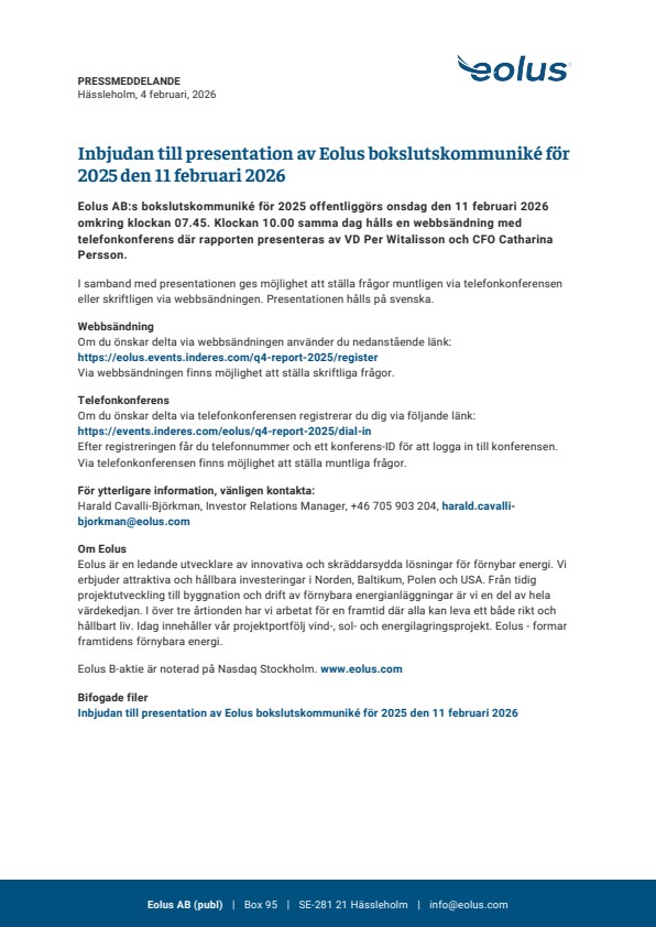 Eolus AB:s bokslutskommuniké för 2025 offentliggörs onsdag den 11 februari 2026 omkring klockan 07.45. Klockan 10.00 samma dag hålls en webbsändning med telefonkonferens där rapporten presenteras av VD Per Witalisson och CFO Catharina Persson.