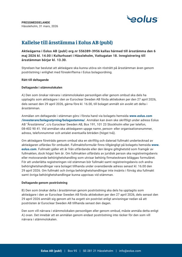 Aktieägarna i Eolus AB (publ) org.nr 556389-3956 kallas härmed till årsstämma den 6 maj 2026 kl. 14.00 i Kulturhuset i Hässleholm, Vattugatan 18. Inregistrering till årsstämman börjar kl. 13.30.
