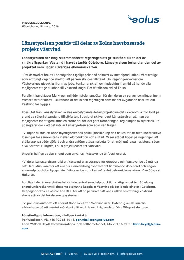 – Det är mycket bra att Länsstyrelsen tydligt pekar på behovet av mer elproduktion i Västsverige som ett tungt vägande skäl för att parken ska ges tillstånd. Om regeringen värnar om Västsveriges utvecklig i form av jobb, konkurrenskraft och industrins framtid så har de alla möjligheter att ge tillstånd till Västvind, säger Per Witalisson, vd på Eolus.