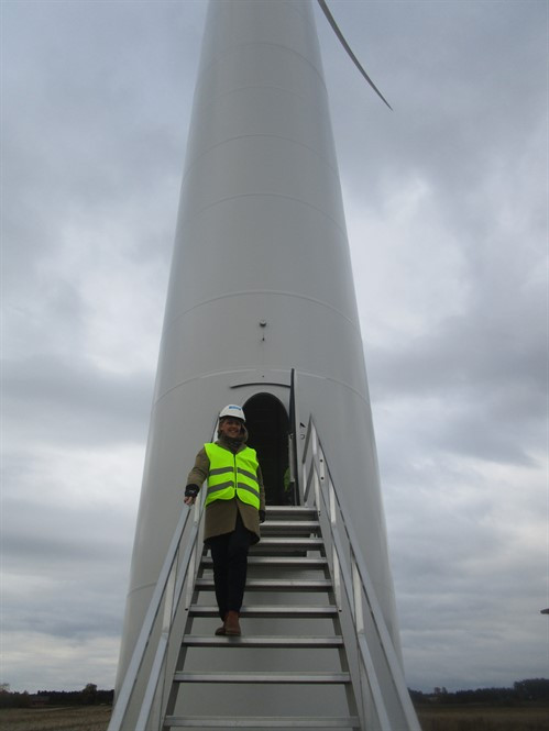Karolina Skog inne i ett av verken av modell Vestas V100 där byggprojektledaren Thomas Henrysson från Eolus berättade om verken och hur de fungerar.