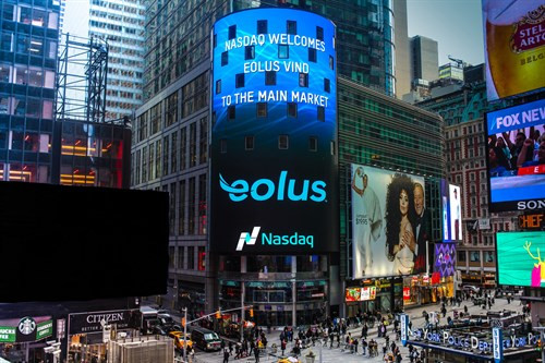 Nasdaq hälsade Eolus välkommet till huvudlistan genom en hälsning vid Times Square i New York City.