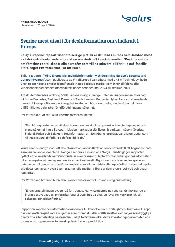 ”Den här rapporten visar att desinformation om vindkraft påverkar investeringsbeslut och energisäkerhet i hela Europa, inklusive marknader där Eolus är verksamt såsom Sverige, Finland, Polen och Baltikum. Desinformation om förnybar energi drabbar alla européer som vill ha prisvärd, tillförlitlig och fossilfri kraft.”