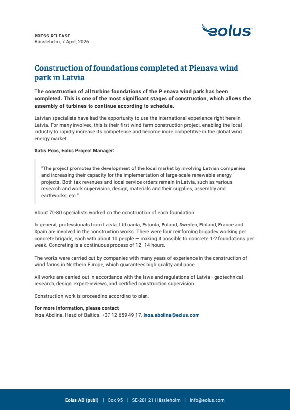 Latvian specialists have had the opportunity to use the international experience right here in Latvia. For many involved, this is their first wind farm construction project, enabling the local industry to rapidly increase its competence and become more competitive in the global wind energy market.