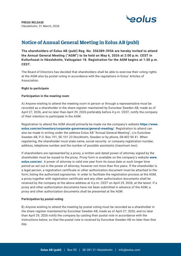 The shareholders of Eolus AB (publ) Reg. No. 556389-3956 are hereby invited to attend the Annual General Meeting (“AGM”) to be held on May 6, 2026 at 2:00 p.m. CEST in Kulturhuset in Hässleholm, Vattugatan 18. Registration for the AGM begins at 1:30 p.m. CEST.